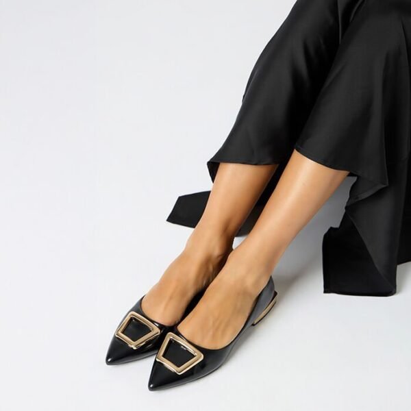 Bailarinas negras brillantes con suela de goma, diseñadas para combinar elegancia discreta y comodidad diaria. El acabado brillante aporta un toque sofisticado y atemporal, ideal para elevar cualquier look sin esfuerzo.