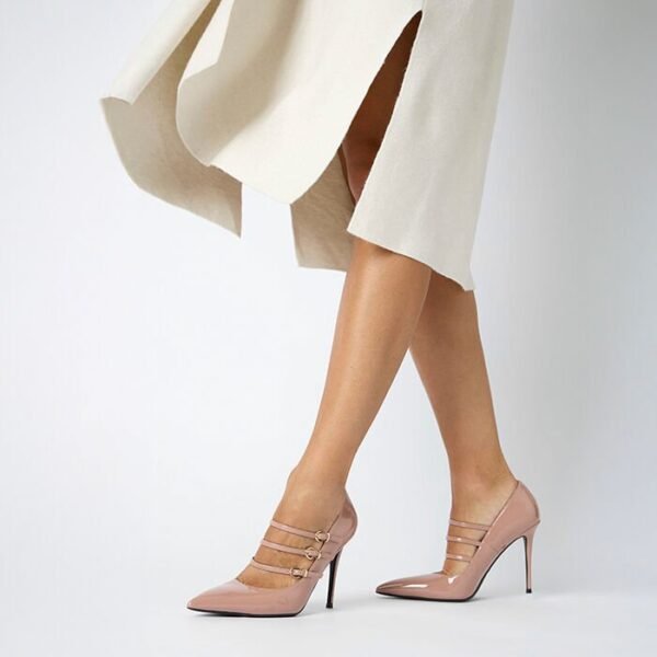 Salón nude en charol con tacón de 10 cm, diseñado para aportar elegancia atemporal y máxima versatilidad. El acabado brillante realza el diseño y alarga visualmente la pierna, convirtiéndolo en un básico imprescindible para cualquier armario femenino.